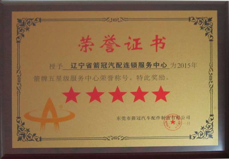 证书编号: 0015 证书名称: 2015年箭冠滤清器荣誉证书 发证机构: 东莞市箭冠汽车配件制造有限公司 生效日期: 2015年01月01日 截止日期: 2021年01月01日 认证简介: 沈阳市箭冠盛德汽配商行荣获2011年箭牌五星级服务中心荣誉称号!!