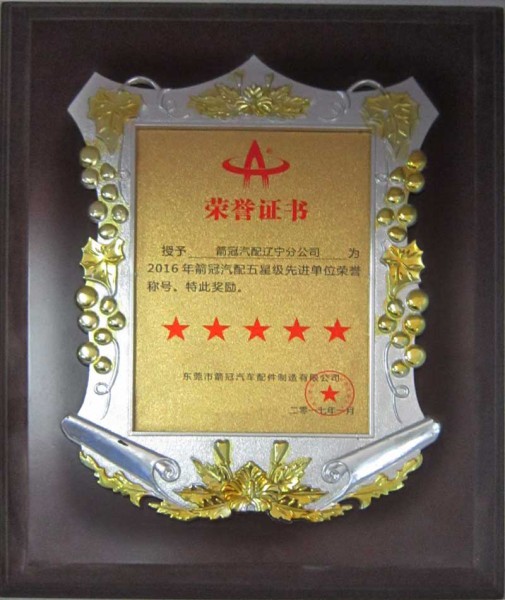 证书编号: 0016 证书名称: 箭冠汽配辽宁分公司2016荣誉证书 发证机构: 东莞市箭冠汽车配件制造有限公司 生效日期: 2016年01月01日 截止日期: 2021年01月01日 认证简介: 箭冠汽配辽宁分公司荣誉2016年箭牌五星级服务中心荣誉称号!!