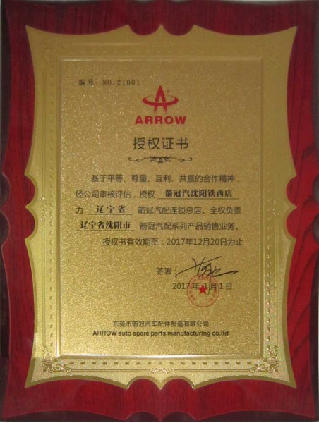 证书编号: 0017 证书名称: 箭冠汽配2017授权书 发证机构: 东莞市箭冠汽车配件制造有限公司 生效日期: 2017年01月01日 截止日期: 2021年01月01日 认证简介: 基于平等、尊重、互利、共赢的合作精神,经公司审核评估,授权箭冠汽配沈阳铁西店为辽宁省箭冠汽配连锁总店。全权负责辽宁省沈阳市箭冠汽配系列产品销售业务。
