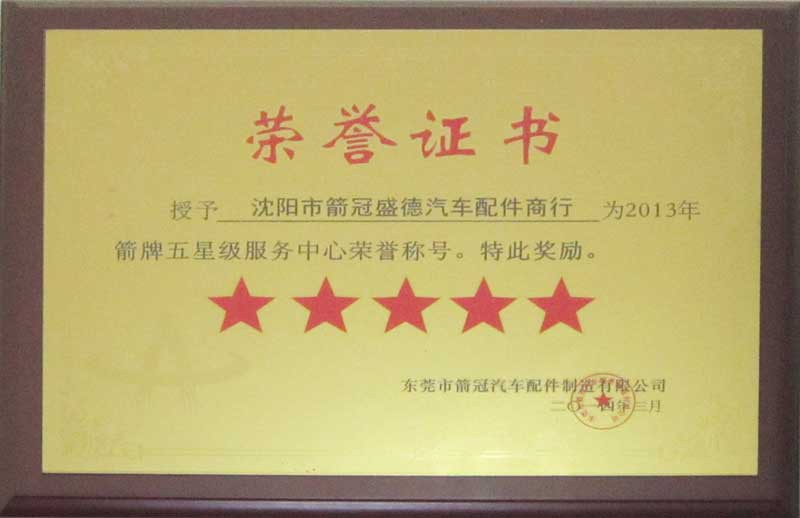 证书编号: 0013 证书名称: 2013年箭冠滤清器荣誉证书 发证机构: 东莞市箭冠汽车配件制造有限公司 生效日期: 2013年01月01日 截止日期: 2021年01月01日 认证简介: 沈阳市箭冠盛德汽配商行荣获2013年箭牌五星级服务中心荣誉称号!!