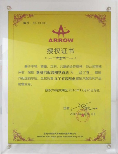证书编号: 0014 证书名称: 箭冠汽配2016授权书 发证机构: 东莞市箭冠汽车配件制造有限公司 生效日期: 2016年01月01日 截止日期: 2021年01月01日 认证简介: 基于平等、尊重、互利、共赢的合作精神,经公司审核评估,授权箭冠汽配沈阳铁西店为辽宁省箭冠汽配连锁总店。全权负责辽宁省沈阳市箭冠汽配系列产品销售业务。